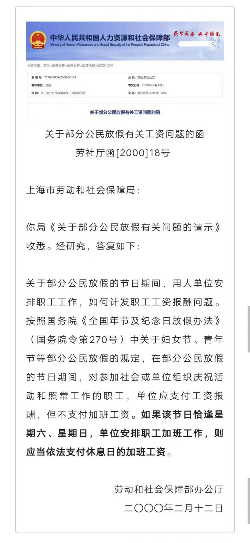 《劳动和社会保障部办公厅关于部分公民放假有关工资问题的函》(劳社厅函〔2000〕18号)进一步明确:如果该节日恰逢星期六、星期日,单位安排职工加班工作,则应当依法支付休息日的加班工资。